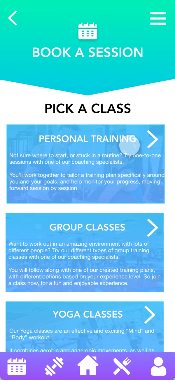 Users have the ability to book different classes and sessions through the app. They have the choice between selecting group sessions, yoga classes and one one one private lessons.